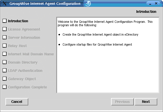 Follow the prompts, using the information from the GroupWise Internet Agent Installation Worksheet.