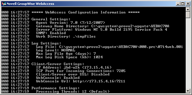 The Windows WebAccess Agent server console lets you monitor the operation of the agent. The server console, shown below, is displayed in a DOS window.