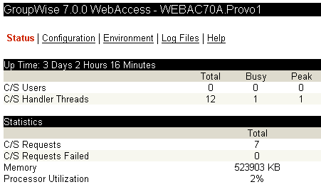 For detailed information about each field on the Status, Configuration, Environment, or Log Files page, select the page, then click Help.