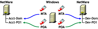 Again, the opposite combination of NetWare agents servicing domains and post offices on Windows servers is not an option because Windows does not support the required cross-platform connection.