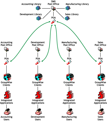 In the illustration, notice that all libraries belong to the DMS post office, which has no users. All GroupWise client users are using client/server access mode, which is required because there are no libraries in their local post offices. Each user has access to all four libraries through TCP/IP links to the DMS POA.