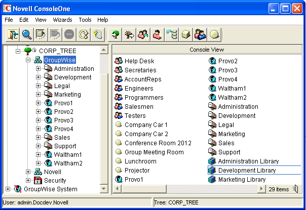 In the Console View in ConsoleOne, you can see the new Library object in the context of its eDirectory container object.