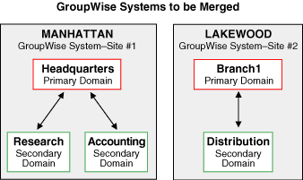 In the above illustration, we have two GroupWise systems that are not connected. We have designated the Manhattan GroupWise system as Site #1 and the Lakewood GroupWise system as Site #2. The Lakewood system will be merged into the Manhattan system.