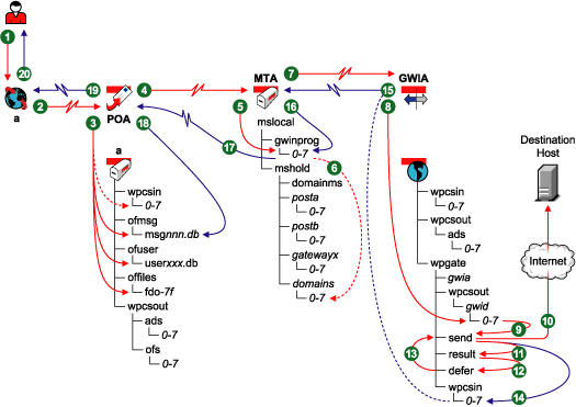 This message flow diagram shows how outbound messages travel through the GroupWise directory structure to the Internet when there is a TCP/IP link between the MTA and the Internet Agent and when the Internet Agent cannot communicate successfully with the Internet host to which the message is addressed.