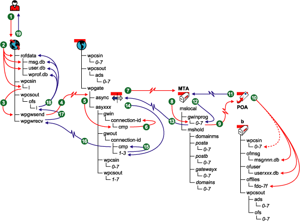 The GroupWise Async Gateway receives the message/request files and places them into it input queue (wpgate\async\asyxxx\gwin\connection_id\cmp) for processing. |