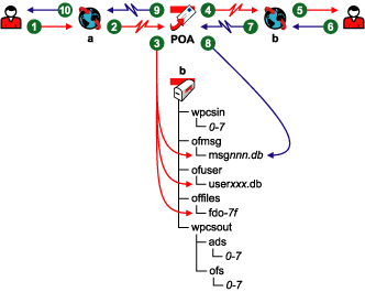 The POA receives the message from the GroupWise client and performs the following actions for the sender: