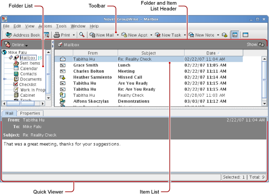 The Main Window is your primary work area in GroupWise. From the Main Window, you can read your messages, schedule appointments, view your Calendar, manage contacts, change the GroupWise mode you’re running in, open folders, open documents, and much more.