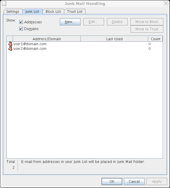 Figure 3-3 Junk Mail Handling Dialog Box Showing the Junk List Tab
