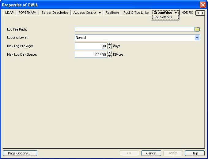 Log Level: Select to display warnings and error messages; this is the preferred logging level. Select to display information about traffic, including non-delivery reports, in addition to warnings and error messages. Information includes the filename, path, message ID, and size of the message being processed; the IP address of any inbound SMTP connections; the Internet Agent-specific MSG number; and SMTP connection messages such as “Connect to novell.com” and “Accepted connection from 172.16.5.18 novell.com”. Select to display a detailed trace of gateway messages, errors, and operations that can be useful for troubleshooting.