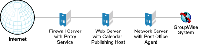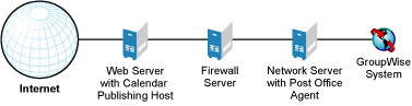 The GroupWise Calendar Publishing Host includes two components: the Calendar Publishing Host itself, which connects to the Internet through a Web server, and the Post Office Agent (POA), which connects to your GroupWise system: