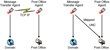 The POA requires direct access to the post office directory so that it can write to the post office database. The MTA requires direct access to the domain directory so that it can write to the domain database. In addition, the POA and the MTA must be able to communicate with each other.