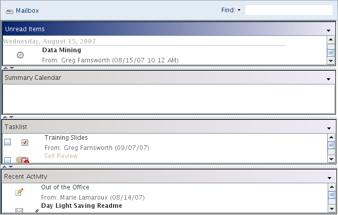 A panel displays a customized view of information in GroupWise. For example, the default Home folder includes an Unread Messages panel, which displays a list of items you have not read. The Tasklist panel is another default panel on the Home folder. The Tasklist panel displays items that are in your Tasklist folder.