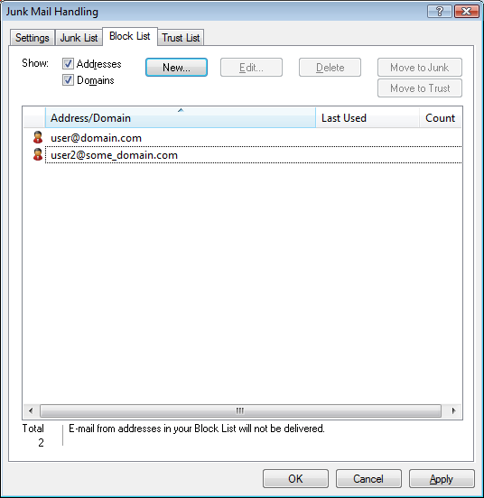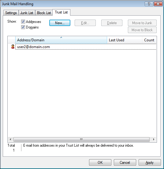 In addition to the Block List and Junk List, there is a Trust List. Use this list to add e-mail addresses or Internet domains that you do not want blocked or junked, no matter what is specified in the other two lists. For example, you have zcompany.com in your Block List, but you have one friend whose address is myfriend@example.com. Add this friend’s e-mail address to the Trust List.