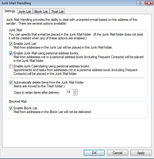However, e-mail from contacts in your Frequent Contact address book and your corporate address book is not blocked.