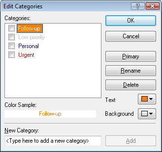 Four default categories (Follow-Up, Low Priority, Personal, and Urgent) are available for you to immediately assign to items. You can modify and delete them if you choose, as well as create new categories.