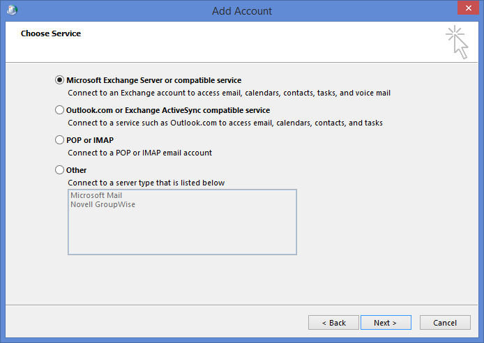 Select Outlook.com or Exchange ActiveSync compatible service, then click Next.