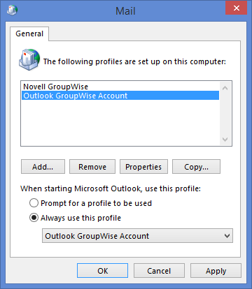 If GroupWise is installed on the machine, the Profiles list includes a GroupWise profile, as shown in the screenshot above. You need to keep this profile and create a new profile.