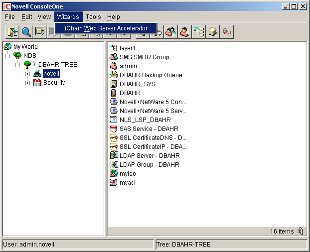 The Wizards menu will become selectable when the user has selected a container in an NDS® tree where iChain objects (iChain Service or ACL) can be created, typically an O (Organization) or OU (Organizational Unit) container.