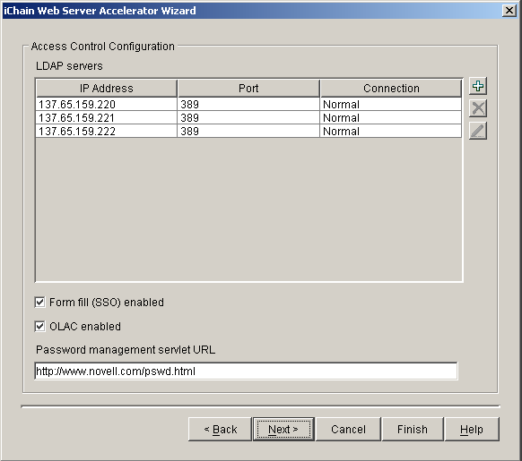 The servers contained in this table are used by the proxy and authorization servers to provide access control to the actual Web servers specified in the Web server accelerators. Each server must be installed in the same directory services tree so that the login information may be used to connect to each one.