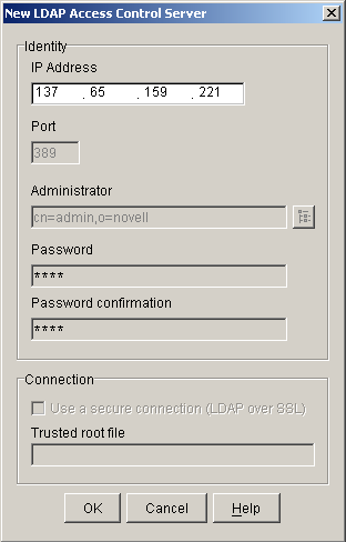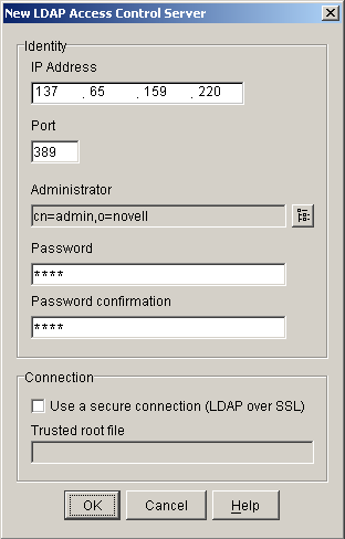 The Add button allows the user to enter information that identifies an access control server. When this button is selected, a dialog box appears which specifies the IP address, port, admin name, password, and security connection parameters, as shown in Figure 25.