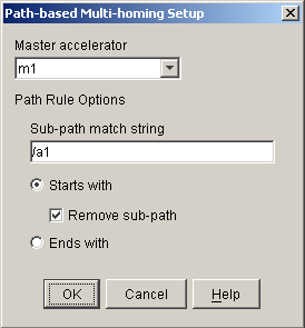 The Options button displays the path-based multi-homing options setup dialog. This dialog box provides the necessary information to set up an accelerator to use a master for path-based multi-homing, as shown in Figure 29:
