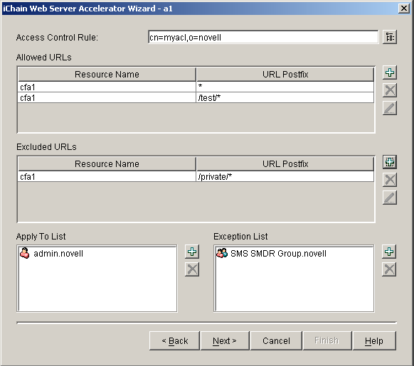 The seventh page of the wizard shows the combination page from the ACL object selected. Like the first page of the wizard, the user can either browse to an existing ACL rule or create a new rule in the container from which the wizard was launched. Once the ACL rule object has been selected, the other tables and lists can be populated as necessary. See Figure 44.