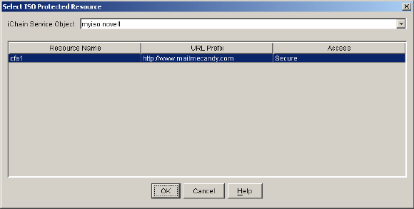 The Select ISO Protected Resource dialog box provides a list of iChain Service Objects and their associated protected resources from which the user can select to add to either the Allowed URL or Excluded URL list. The list is a drop-down list which will contain all iChain Service Objects in the currently selected context. See Figure 46.