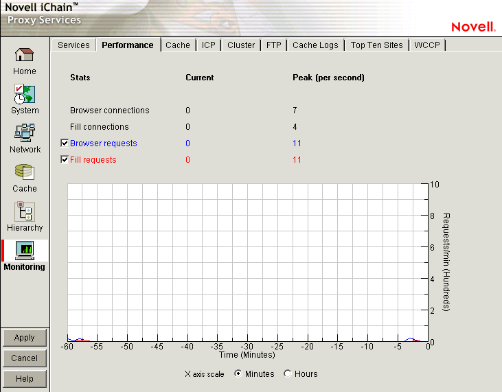 Requests Graph: The HTTP browser requests to the appliance per minute (blue line) and HTTP fill requests to origin Web servers per minute (red line). Click Minutes or Hours to select the scale of the X axis. Minutes displays a one-hour history; Hours shows a 24-hour view.