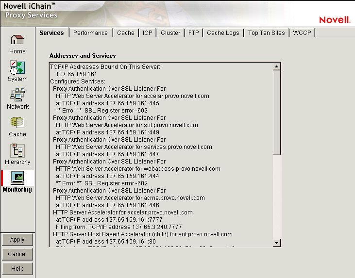 Addresses and Services: Use this list for troubleshooting problems with configured services. It shows active services along with the IP addresses and ports that they are running on. When the appliance detects errors, it displays appropriate error messages next to the services.