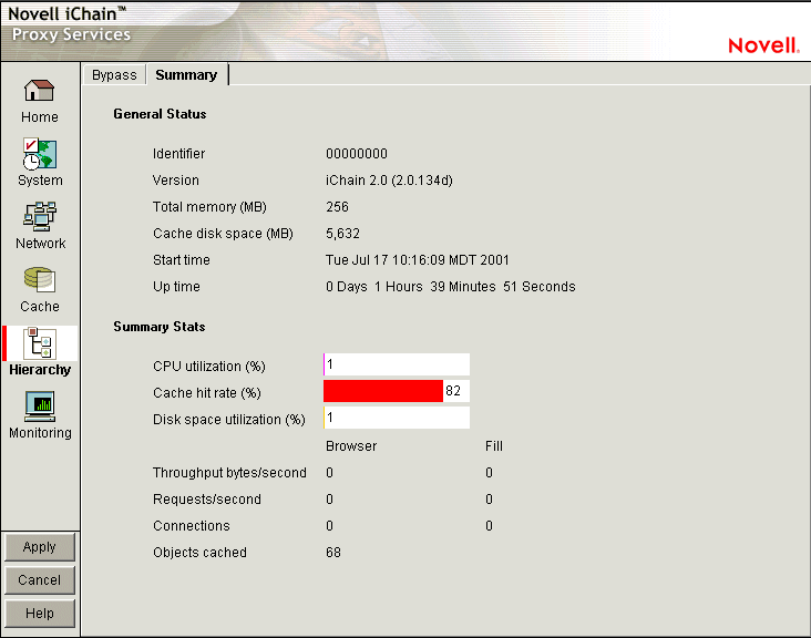 Cache Disk Space (MB): Total disk space available for caching. The amount shown is smaller than the total appliance disk space because it doesn't include the operating system and log partitions. Check this field to verify whether the proxy server has detected all disks installed on the appliance.