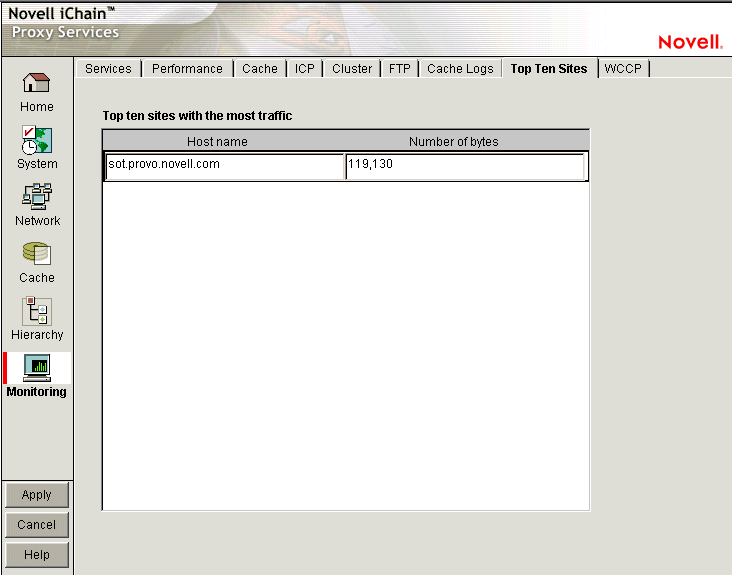 The Top Ten Sites tab displays a list of origin Web servers with more than 0 bytes cached on the appliance. The ten sites with the most total bytes cached are sorted in descending order.