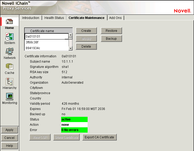 Certificate Name: A list of certificates created on the appliance.