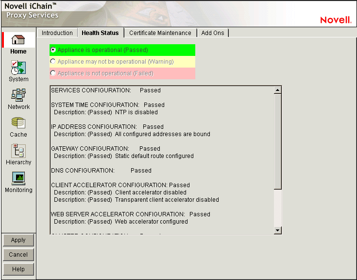 IP Address Configuration: Reports the status of IP address assignments to network interfaces. iChain Proxy Services requires at least one IP address assignment for proper operation.