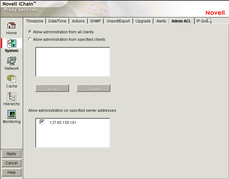 Allow Administration from Specified Clients: When you select this option you must also insert at least one IP address from which IP administrative access is allowed. Otherwise, the system will deselect the option to prevent a global lockout.