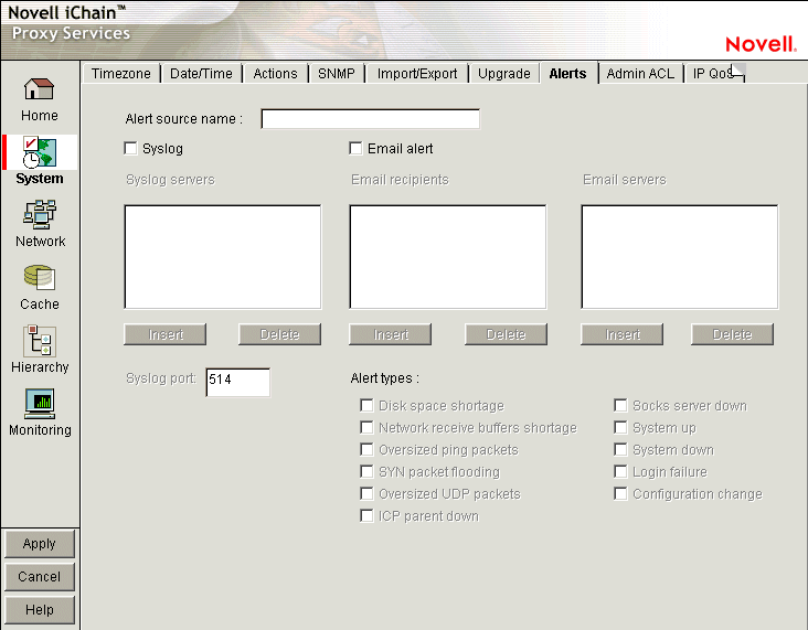 The Alerts tab lets you configure the appliance to send notification of generated system alerts to a network server hosting a Syslog service and to a list of e-mail recipients.