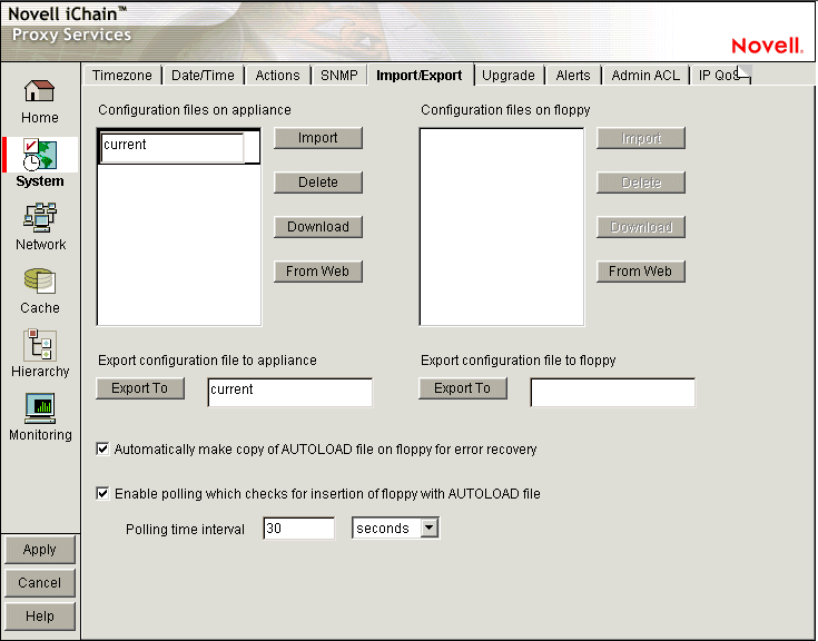 Enable Polling which Checks for Insertion of Floppy with AUTOLOAD File: Allows the polling of the floppy diskette during normal operation of the appliance. If a floppy containing an AUTOLOAD.NAS is inserted when this option is on, iChain Proxy Services automatically applies the settings in the AUTOLOAD file.