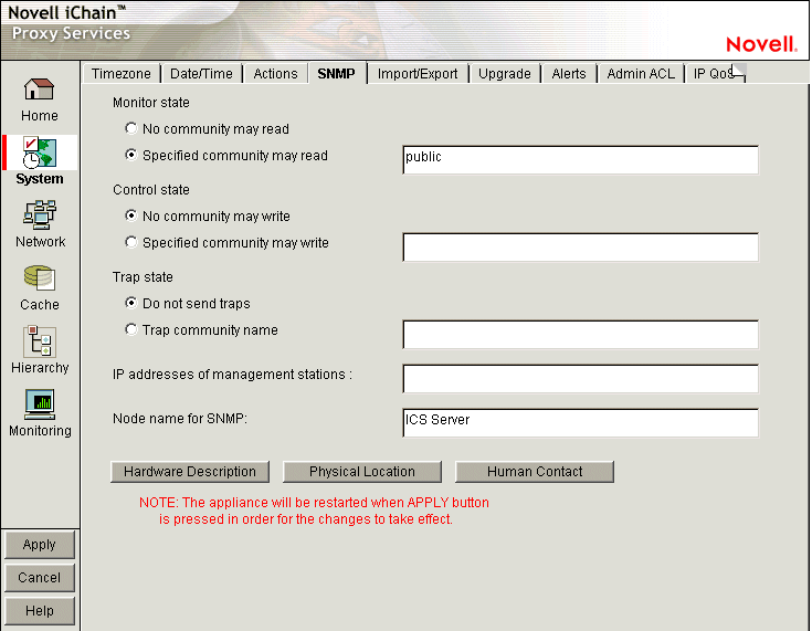 Monitor State: Allows you to specify community Read access and the community name or password to be used. Community names must contain ASCII characters only and must not have spaces.