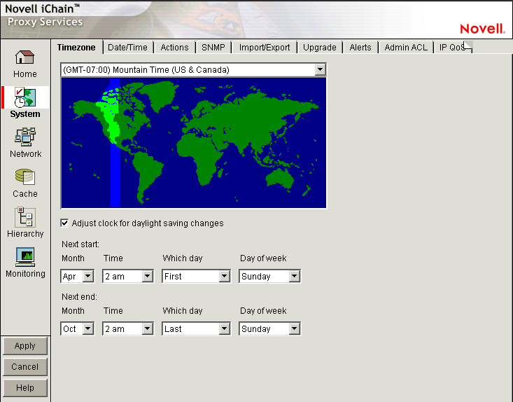 NOTE: iChain Proxy Services stamps log entries with Greenwich Mean Time (GMT). If the appliance is using an NTP server, the GMT stamp comes from that server. If the appliance is using a manually set time, iChain Proxy Services assumes the time is accurate and calculates the GMT value based on the appliance's time zone and daylight saving settings.