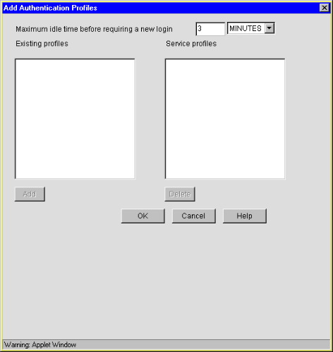 The Existing Profiles list shows all the authentication profiles you have created. See Authentication Dialog Box. The Service Profiles list contains the profile that is active for the proxy service from which you accessed the Add Authentication Profiles dialog box.