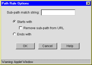 When you enable path-based multi-homing for the accelerator you are defining, you must also click the Path Rule Options button and specify a path rule that the multi-homing master can use to route traffic to the accelerator you are defining. For more information, see Path Rule Options Dialog Box.
