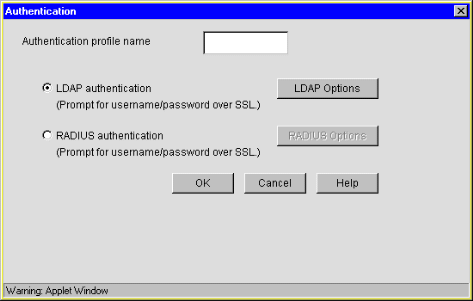 Enable Authentication: Checking this box causes the appliance to require authentication of users wanting to use its Web server accelerator services. Clicking Authentication Options displays the Add Authentication Profiles dialog box.