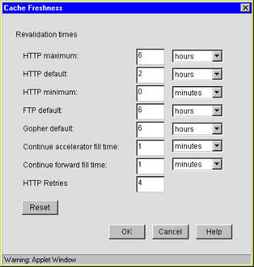 The Cache Freshness dialog box lets you set time values governing when iChain Proxy Services revalidates requested cached objects against those on their respective origin Web servers. If requested objects have changed, iChain Proxy Services re-caches them. Default field values are shown in Figure 90.