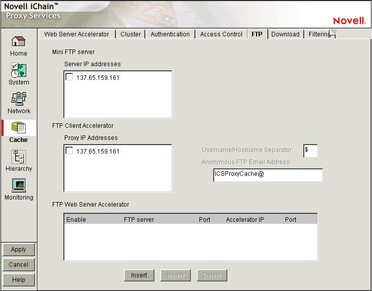 FTP Default: The number of hours or days FTP data remains in cache before it expires. iChain Proxy Services does not revalidate expired FTP objects. It simply recaches them when they are requested.