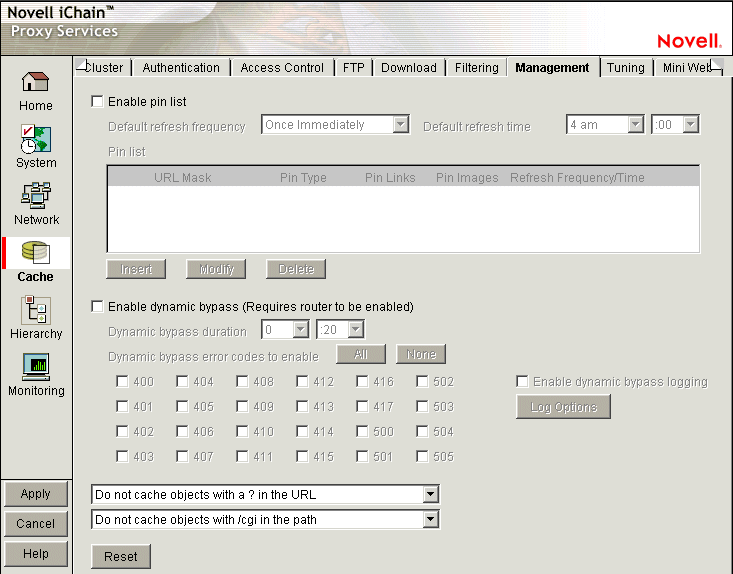 The Management tab lets you identify objects that will be either pinned (explicitly downloaded and retained in cache as long as possible) or bypassed (explicitly not cached when requested by users). It also lets you specify how pinned objects are stored on the appliance (pin type).