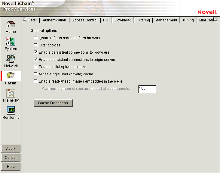 Enable Read-Ahead Images Embedded in the Page: If checked, iChain Proxy Services will retrieve and cache objects that have been flagged Read-Ahead. You specify the maximum number of Read-Ahead objects the proxy server will retrieve in the Maximum Number of Concurrent Read-Ahead Requests field.