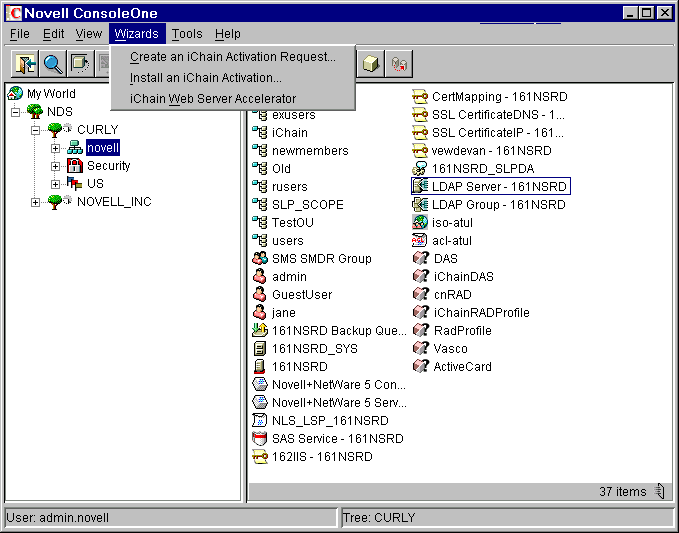 The Wizards menu will become selectable when the user has selected a container in a Novell eDirectory® tree where iChain objects (iChain Service or ACL) can be created, typically an O (Organization) or OU (Organizational Unit) container.