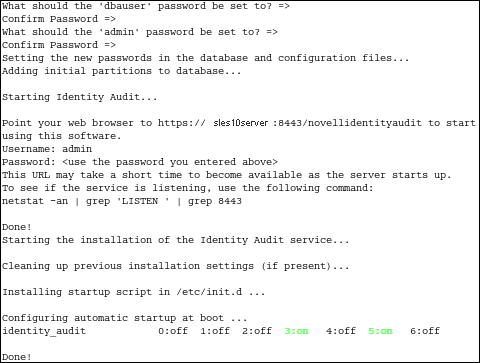 The dbauser credentials are used to create tables and partitions in the PostgreSQL database. Identity Audit is configured to start up with runlevels 3 and 5 (Multi-User Mode with boot-up in console or X-Windows mode).