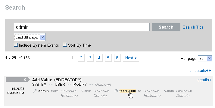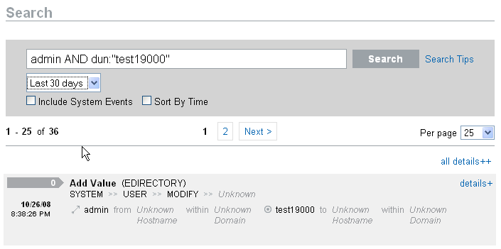 Users can view additional details about any event or events by clicking the link on the right side of the page.The details for all events on a page can be expanded or collapsed by using the All Details++ or link. This preference is retained as you scan through multiple pages of results or execute new searches.