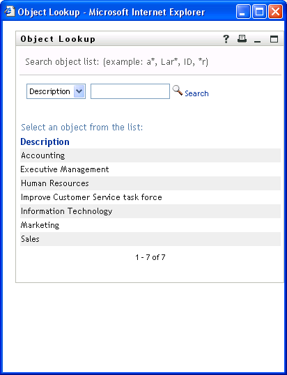 The user can select a value from the list to populate the control. The attribute displayed in the drop-down list ( in the above example) is specified in the directory abstraction layer. You specify it in the attribute’s UIControl property. See Attribute UI Control Properties. The availability of this button is controlled by the Show object selector property. |