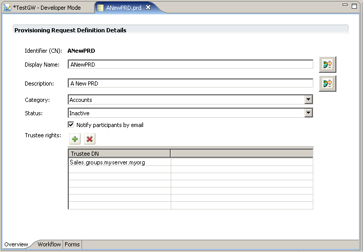 Specifies the status of the provisioning request definition: Active: Select to make the provisioning request definition available for use in the user application. Inactive: Select to make the provisioning request definition temporarily unavailable for use in the user application. You can use this option when you want keep the roles of the person who develops and deploys the provisioning request definition separate from the person who activates the provisioning request definition. For example, a developer could deploy the provisioning request definition as Inactive, and an administrator could be responsible for changing the status to Active. Template: Select if you want to use this provisioning request definition as the basis for other provisioning request definitions. Templates are not available for use in the user application. Retired: Select to mark the provisioning request definition as permanently unavailable for use in the user application (you can still change the status of the provisioning request definition at any time). This status provides a way of keeping a historical record of a provisioning request definition that is no longer in use. |